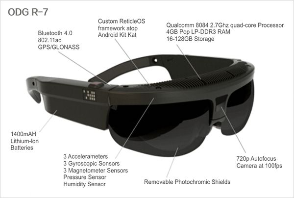 R-7 smart glasses is the best-value product of ODG. It is mainly applied in corporations and industries. The image can be displayed whether on the glasses or as a 3D and animated image in the air over the physical object. This product weighs only 4 ounces. It has Qualcomm Snapdragon 805 processor, customized Reticle OS operation system and Android Kit Kat. Moreover, it applied Qualcomm Vuforia mobile visual platform technology while made compatible with other Android systems. The target applying fields of R-7 consist of health care, energy, transportation, warehouse, logistics and government management.